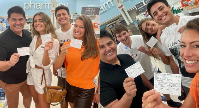 Apresentador, a mulher Elaine Mickely, e os filhos, Luma e Luigi, estão de férias na Flórida, e celebraram a imunização com a 2ª dose